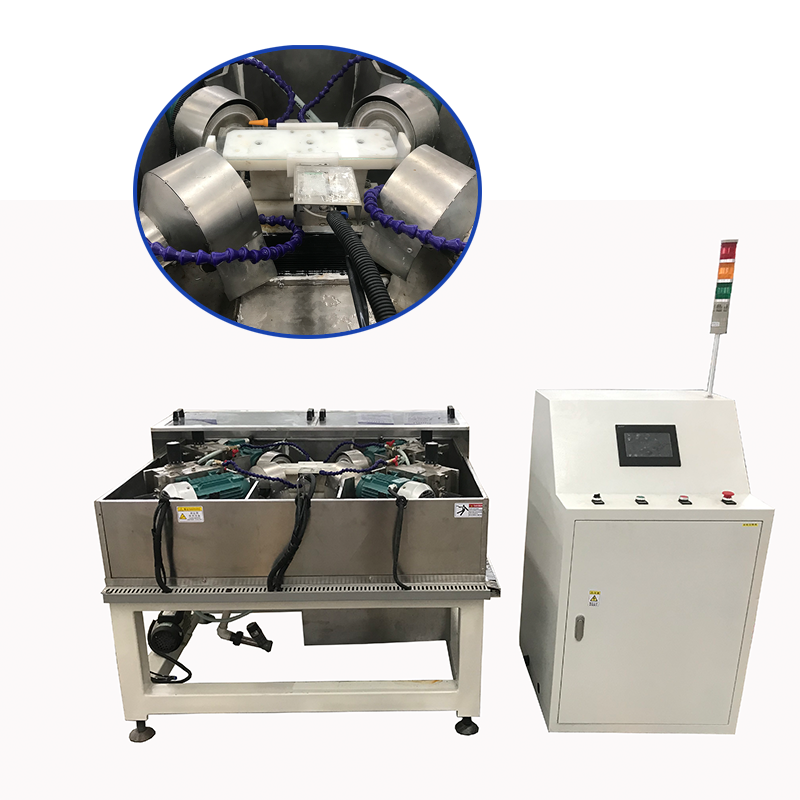 四角電機水平放置+磨盤(高度可調(diào)),用來磨四個安全角。中間為四方夾持系統(tǒng)固定白板;加持系統(tǒng)在伺服電機帶動下可做往復運動。從而實現(xiàn)四個尖角的安全角磨削。另磨頭電機帶有兩軸調(diào)節(jié)功能,可以調(diào)節(jié)磨邊深度大小,和砂輪左右平移功能(防止砂輪固定位置磨削造成的端面固定位置磨損),水箱帶有自動水位檢測功能,磨邊時要做到無水設(shè)備保護停止并報警功能