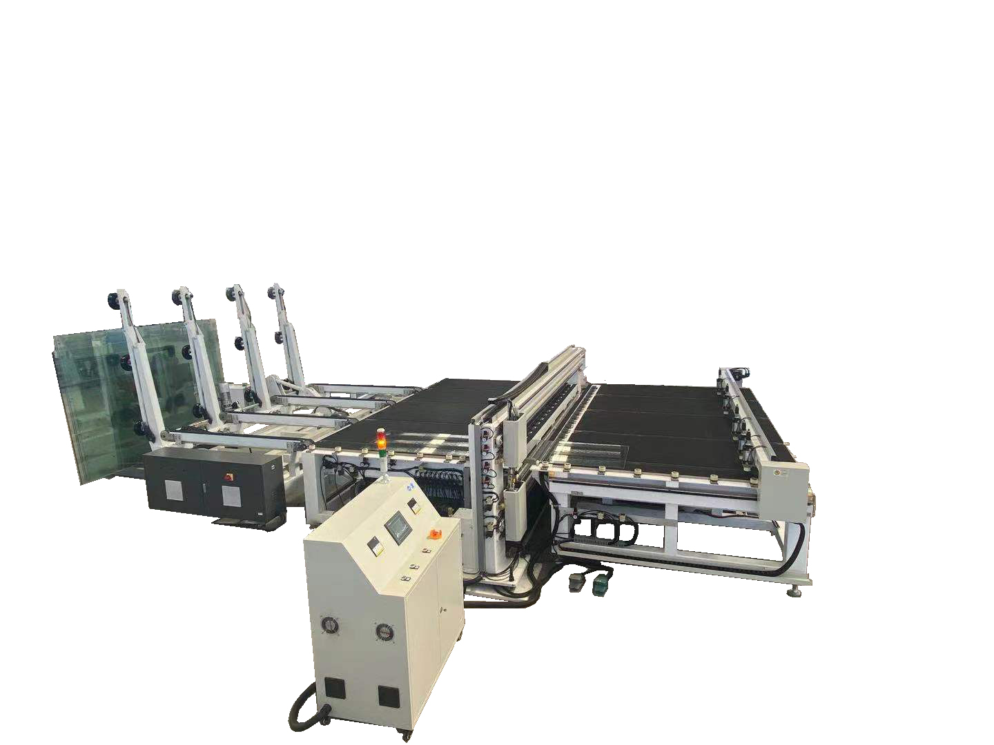 Man-machine interface HMI setting system parameters such as glass width, length, under knife pressure, etc.一一mechanical placement of glass into the synchronous belt area of the cutting table一一Automatic transmission and positioning of glass according to the cut size of input(There's a location system)一一Knife head at zero一一Pneumatic lower knife, upper and lower knife wheel cut(There's an automatic injection system)一一Cut and lift一一The upper press starts the press, and the lower surface glass breaks open一一Under the top rod up the glass, the upper surface of the glass break open一一Heat bar, start heating一一The vacuum suction cup absorbs the glass on both sides of the tangent line and pulls the cutting seam apart一一Cutting film(PVB or EVA)一一The cutting action is complete and the entire artifact is transferred to the next segment tangent position(If you need to turn around and cut, you need to do it manually)一一Whole cutting is complete.一一Manually move the processed glass to the lower slide flip bracket with the air float assembly.