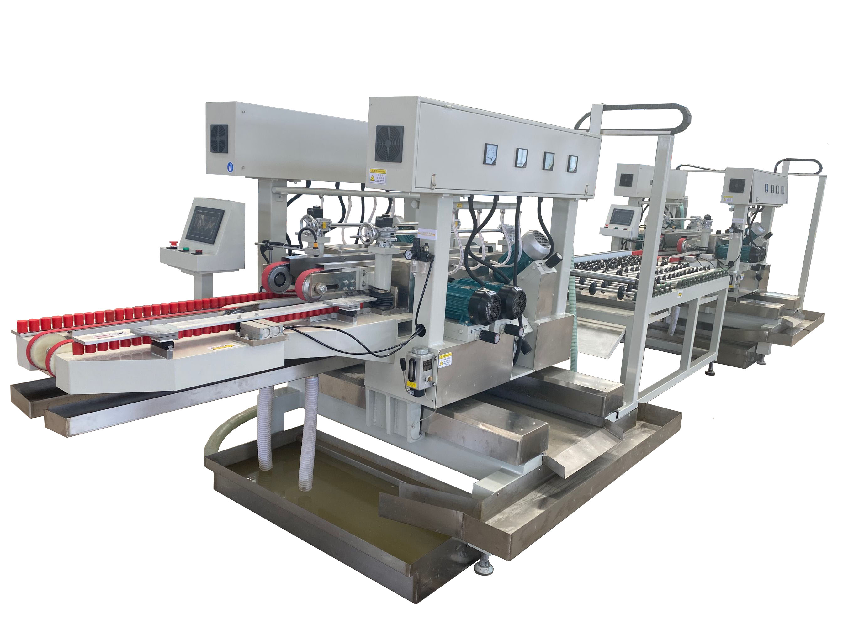 ? ? ? ? 設(shè)備適用于磨削平板玻璃,分別適用平底粗磨、精磨、上下倒角可一次性完成(我司可配套玻璃清洗設(shè)備及自動上下料機(jī)械手),采用雙直線導(dǎo)軌、雙滾動珠絲桿,實(shí)現(xiàn)穩(wěn)定精確的自動開合。玻璃傳送為變頻器調(diào)速,控制軟件自行設(shè)計(jì),觸摸屏顯示。