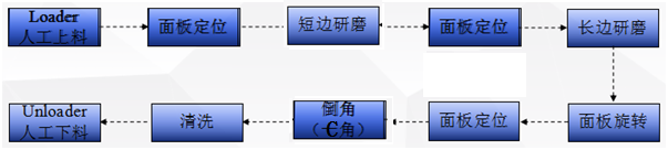該基板磨邊倒角機(jī)采用半自動(dòng)化,即人工上、下料(可適配機(jī)器人或機(jī)械手),中間工序自